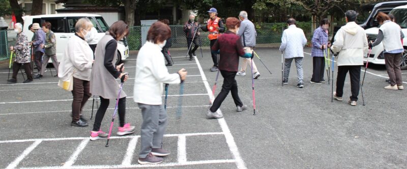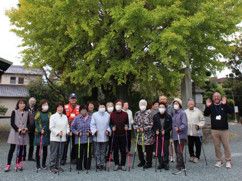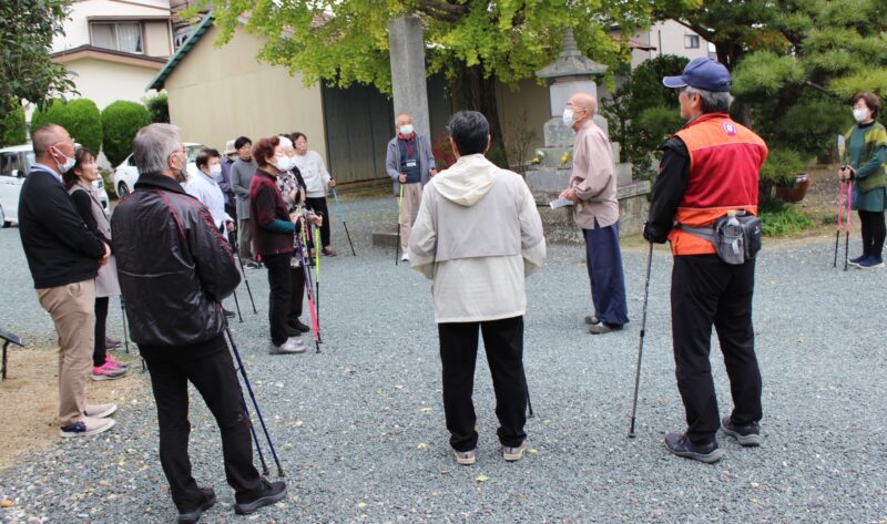 今回はノルディックウォークの体験です。インストラクターよりポールの持ち方や歩き方を学び近くの日蓮宗本乗寺までウオーキングしました。