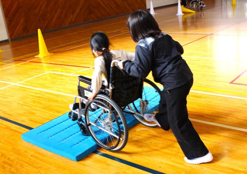 今回の目的は、車椅子に乗る側、介助する側の両方を体験し相手を思いやるコミュニケーションの大切さを学ぶことです。体験では、マットの段差を使いステッピングバーを踏んでキャスターを上げる練習やスロープを後ろ向きで安全に下る方法を学びました。介助する児童は、「いくよ」「大丈夫?」と声を掛けながら友達が安心して乗れるように気を配っていました。CSWから、「安全第一で無理をしないこと」「乗っている人との会話を大切にすること」が伝えられ児童はどの場面でも互いに思いやりながら真剣に取り組む姿が見られました。