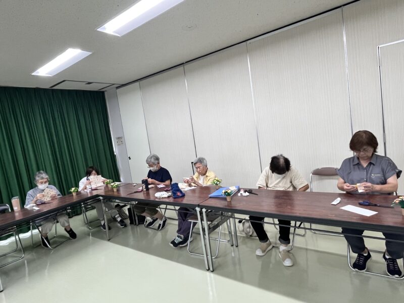 まだまだ暑い日が続いており、会場内に入ってきた参加者同士「暑くて、日中出歩くこともできないね」とおしゃべりを楽しみながら、脳トレパズルと画用紙を使ってお花づくりを行いました。