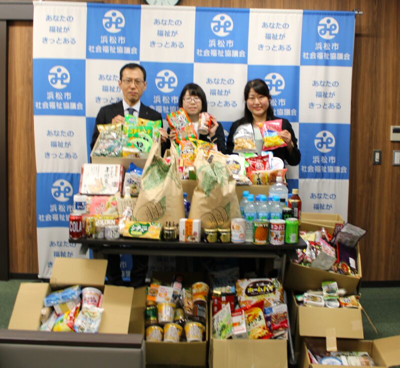 日本生命保険相互会社 浜松支社様より、「社会貢献活動」として社員に各家庭で余っている食品の提供を呼びかけ、集まった食品14箱とお米2袋のご寄付をいただき贈呈式を行いました。