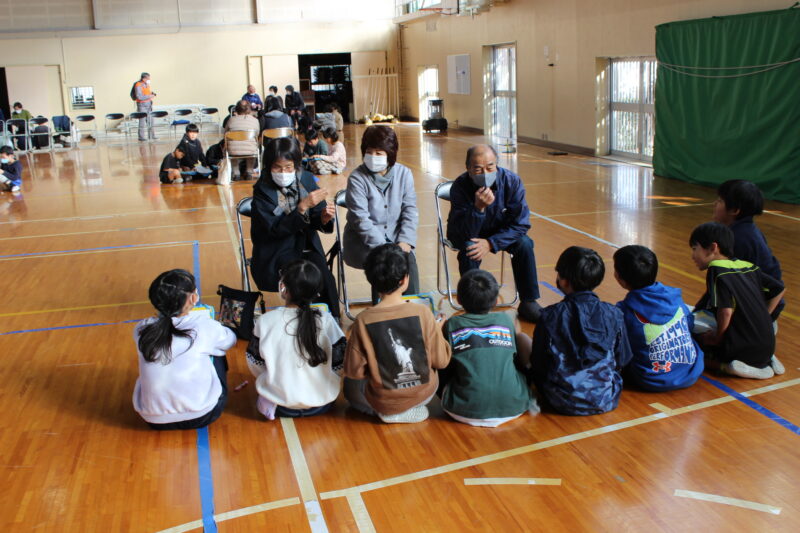 1. 前半「地域の方に昔の話を聞こう」地域の方2~3名と児童7~8名で1グループを構成し、全16グループに分かれて昔の生活の様子や地域の歴史、子ども時代の遊びなどについてお話を伺いました。児童たちは真剣にメモを取りながら耳を傾け、地域の方々の貴重な体験に触れる時間となりました。