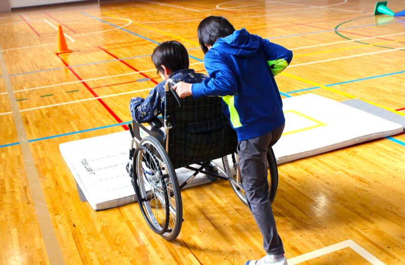始めに教室で福祉講話を行い、児童たちと「ふくし」について話し合いました。続いて、体育館では車椅子体験を行い、声掛けや会話などコミュニケーションの大切さなど、体験を通して様々な福祉について学びを深めていただきました。